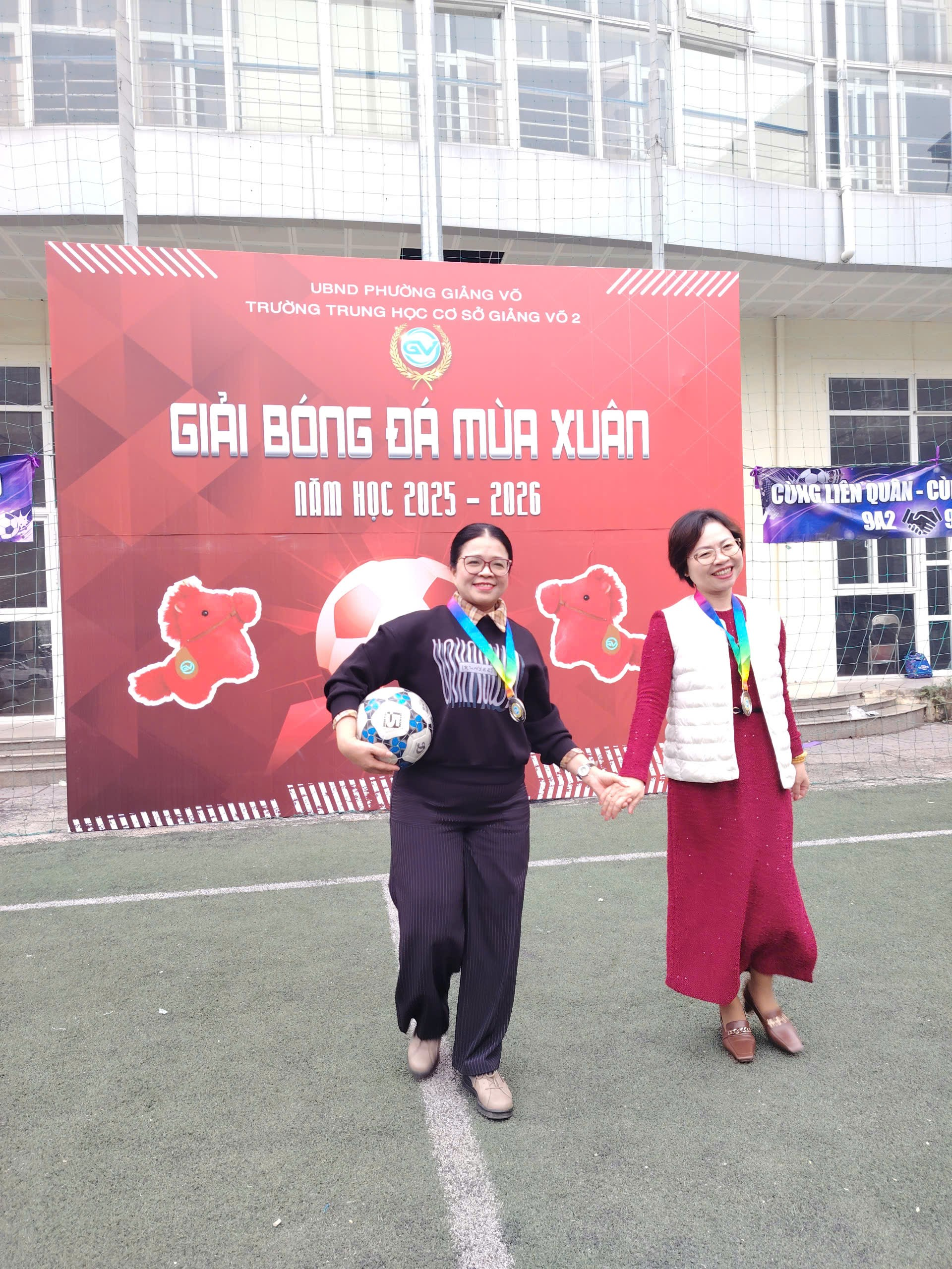 Giữa lúc trận chung kết diễn ra sôi nổi, cô hiệu trưởng Hương Giang và cô phó hiệu trưởng Mai Hoa đã ra sân cổ vũ cho cả hai đội. Hai cô hòa vào vòng cổ động viên, chăm chú theo dõi từng pha bóng và vỗ tay khích lệ mỗi tình huống hay. Sự hiện diện gần gũi ấy khiến bầu không khí thêm ấm áp và công bằng, tiếp thêm tinh thần cho các cầu thủ hai bên thi đấu hết mình. Trận chung kết vì thế không chỉ là cuộc tranh tài quyết liệt mà còn là khoảnh khắc đẹp của tinh thần thể thao và sự đồng hành của thầy cô.