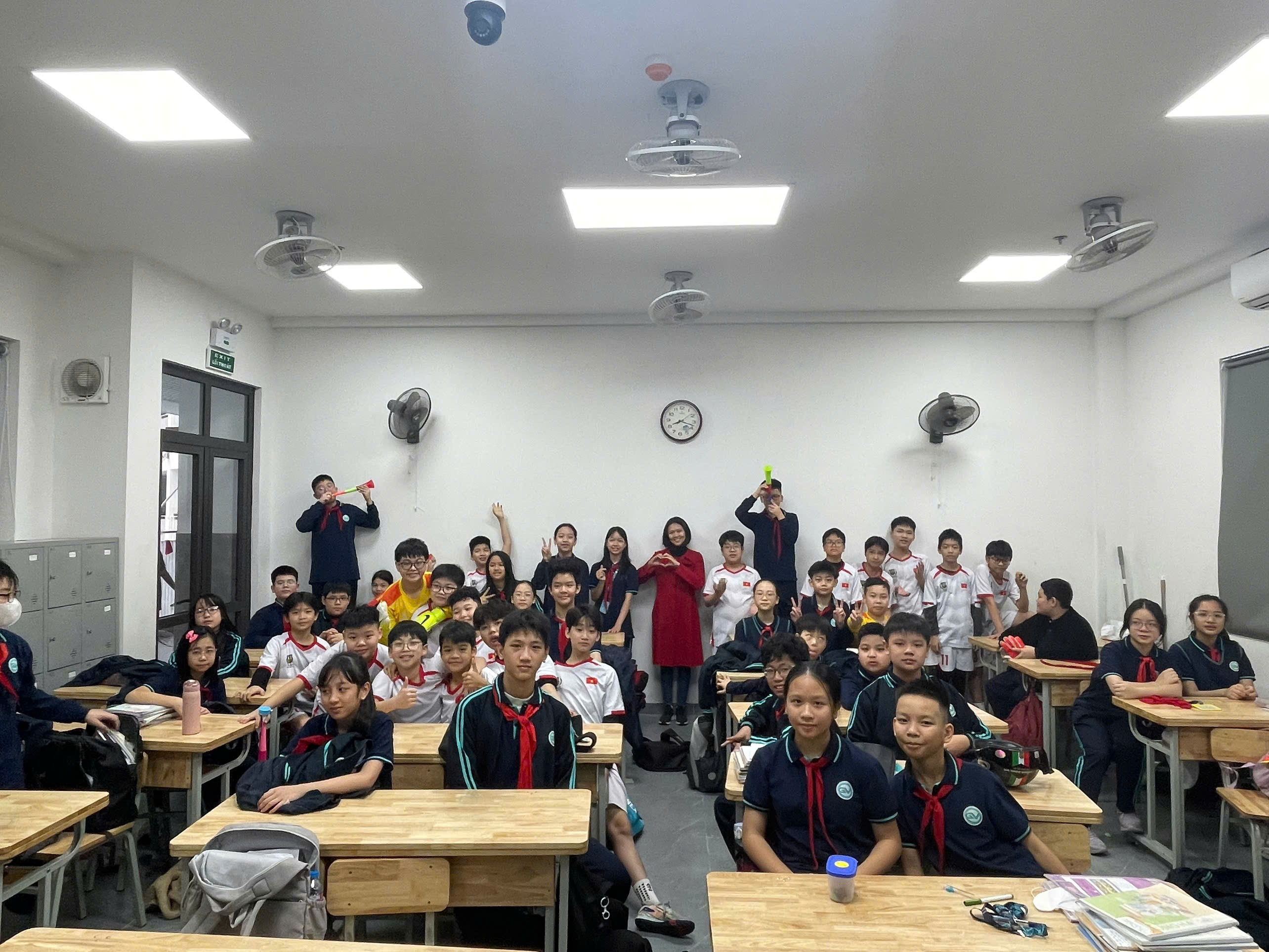 Cô và trò lớp 6A3 rạng rỡ trong khoảnh khắc chúc mừng đội bóng chiến thắng