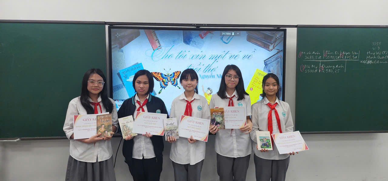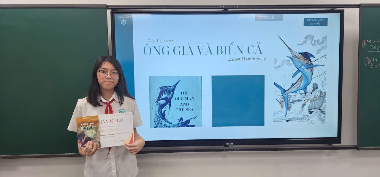 Mỗi bài thuyết trình là một sự kết hợp độc đáo giữa kiến thức sâu sắc về nội dung sách và sự tự tin trên bục giảng. Các bạn không chỉ đơn thuần tóm tắt mà còn phân tích ý nghĩa, đưa ra cảm nhận cá nhân, và sử dụng các công cụ hỗ trợ để làm nổi bật thông điệp của tác phẩm. Nhờ vậy, bầu không khí trong lớp 8A3 luôn sôi nổi, đầy ắp sự thích thú và tò mò. Cuộc thi đã khép lại bằng những giây phút hồi hộp khi công bố kết quả. Với sự thuyết phục tuyệt đối, Giải Nhất đã thuộc về bạn Bùi Lê Minh Anh với bài review đầy cảm xúc, chạm đến trái tim người nghe về tác phẩm "Cho tôi xin một vé đi tuổi thơ". Các giải thưởng khác cũng đã tìm được chủ nhân xứng đáng: Giải Nhì thuộc về bạn Vương Tâm Di với phần trình bày sâu sắc về tác phẩm kinh điển "Ông già và biển cả", và Giải Ba được trao cho bạn Lê Hà My, cũng với cuốn "Ông già và biển cả", người đã mang đến một góc nhìn mới mẻ, khẳng định sức sống của tác phẩm này qua nhiều thế hệ.