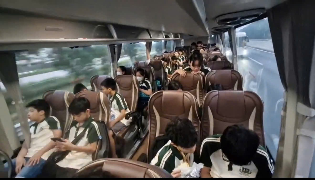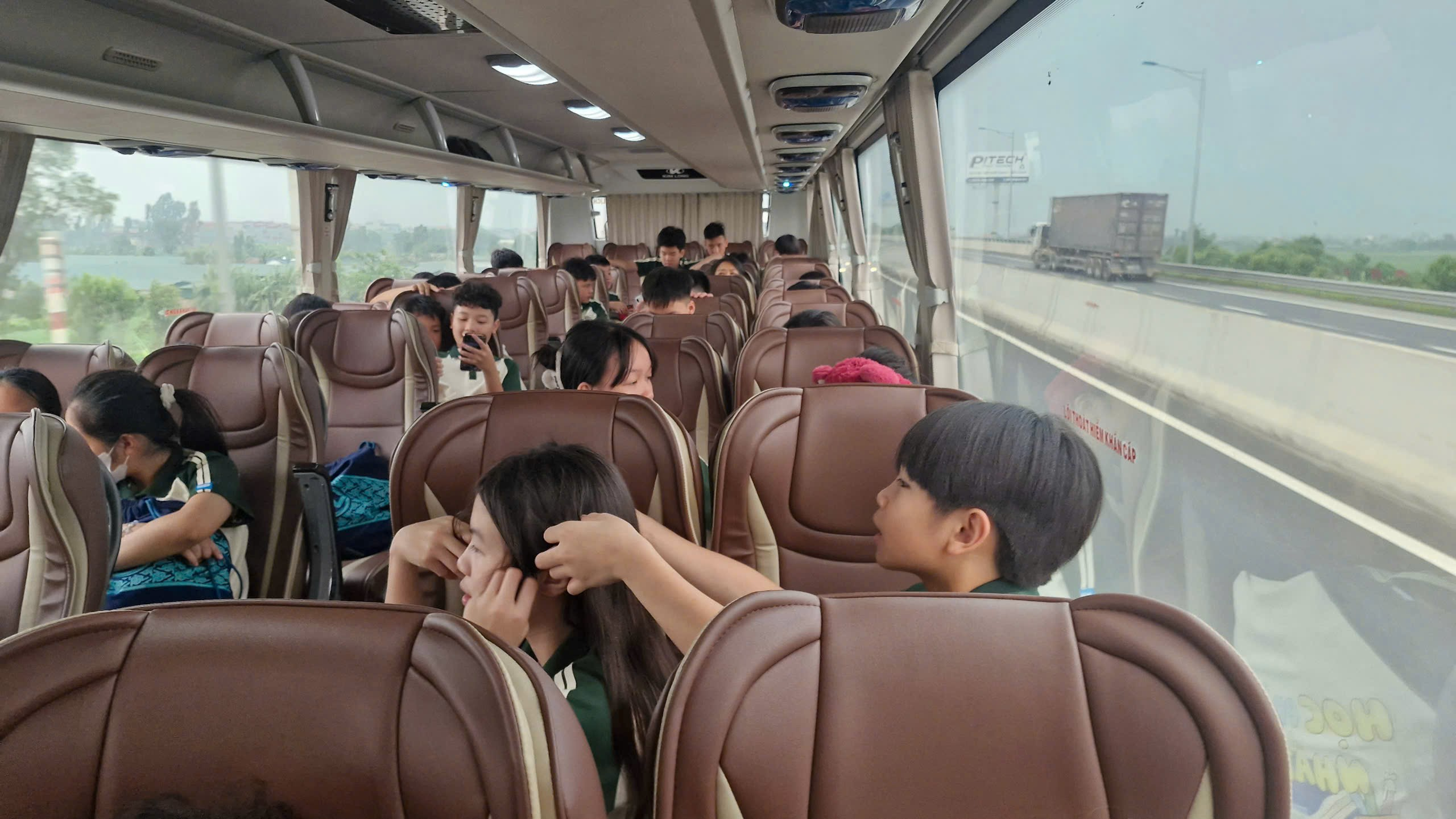 Khi đồng hồ điểm 5h30, bánh xe bắt đầu lăn, mang theo bao tiếng cười và những câu chuyện ríu rít suốt chặng đường. Chúng mình được di chuyển trên chiếc xe 45 chỗ hiện đại, êm ái, khiến quãng đường dài trở nên nhẹ nhàng và thoải mái.