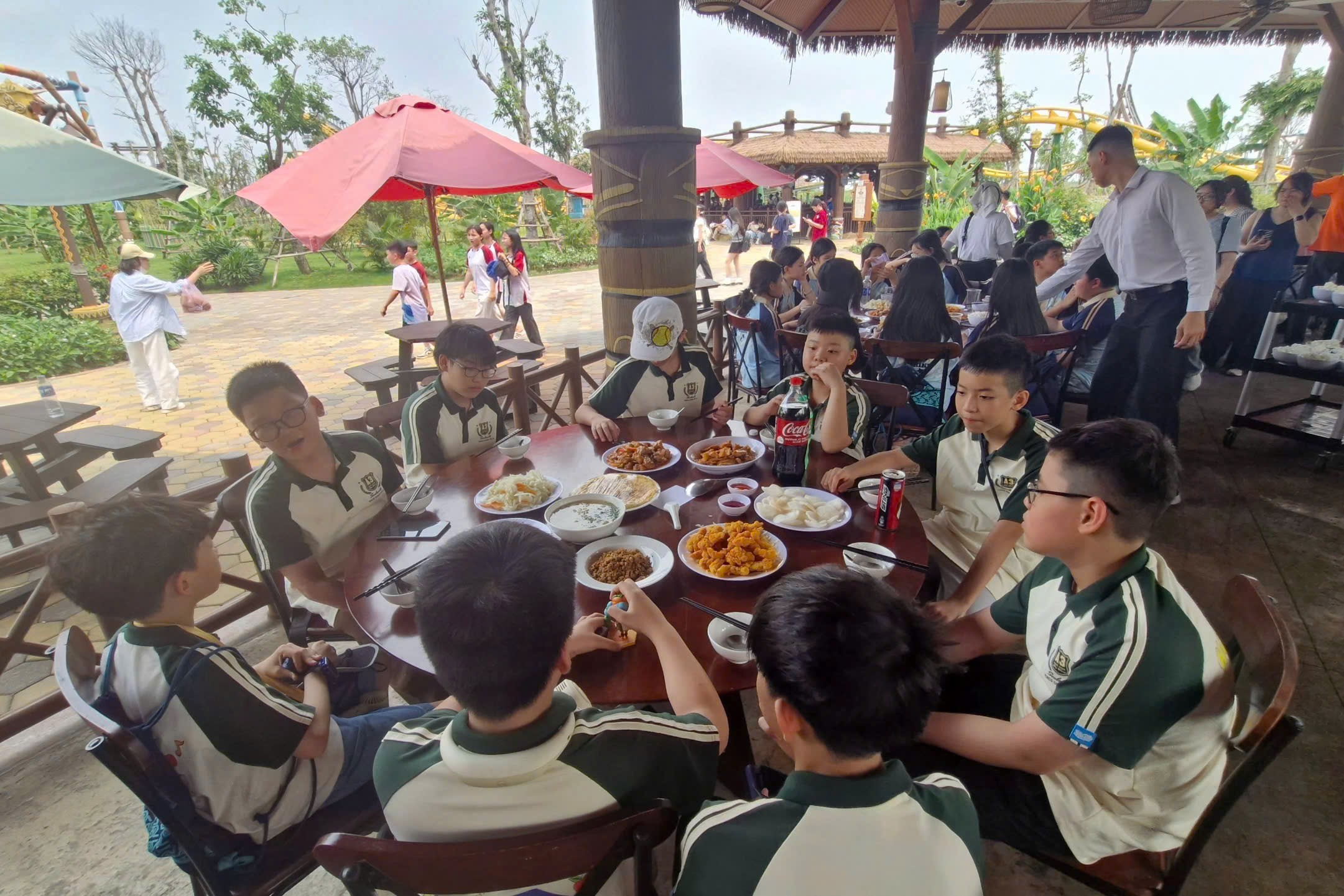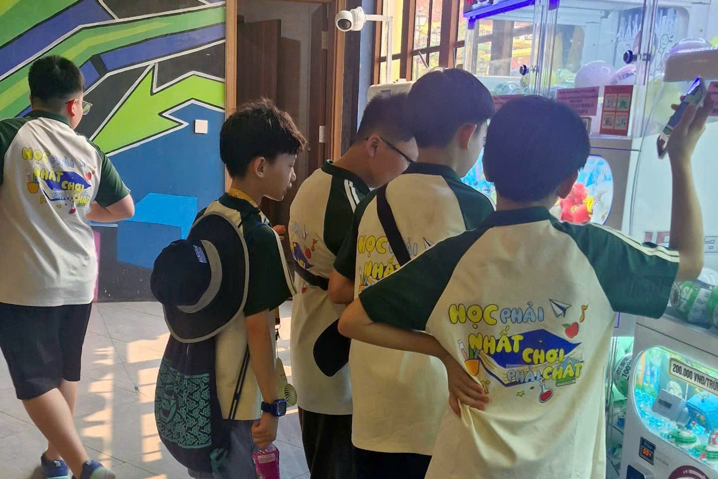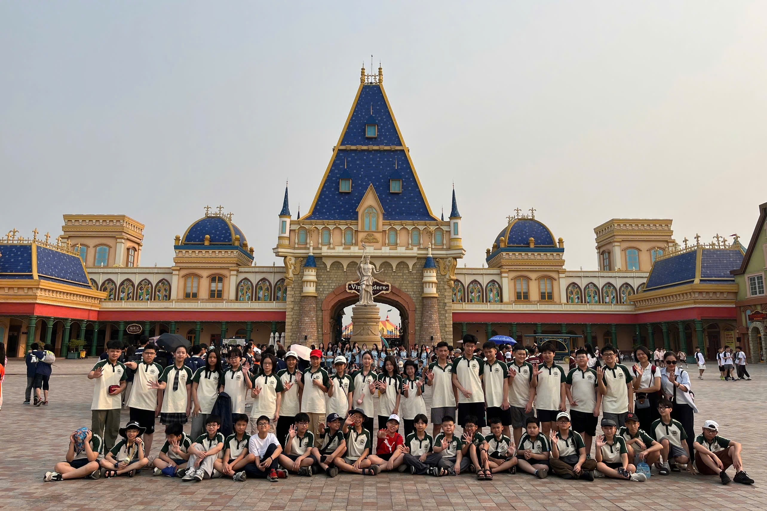 Đúng 8h30, VinWonders Vũ Yên hiện ra trước mắt – rộng lớn, hiện đại và đầy màu sắc. Đó không chỉ là một khu vui chơi, mà giống như một thế giới hoàn toàn khác, nơi mọi cảm xúc được “đánh thức”. Không bỏ lỡ khoảnh khắc nào, cả lớp nhanh chóng lưu lại những bức ảnh kỉ niệm thật đẹp trong bộ đồng phục riêng đầy tự hào.