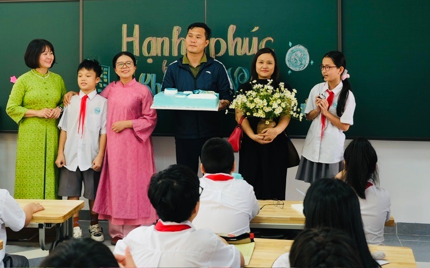 Điều đặc biệt trong ngày hôm nay – khi trở về không gian học tập mới, tập thể lớp 6A4 đã vô cùng xúc động trước tình cảm của cô Hiệu trưởng Phạm Thị Hương Giang cùng các thầy cô. Trên tay cô là chiếc bánh gato khổng lồ, món quà đầy ngọt ngào gửi đến lớp như lời chúc mừng và động viên. Đó không chỉ là một chiếc bánh, mà còn là minh chứng cho sự quan tâm sát sao, tình yêu thương học trò không khoảng cách của cô Hiệu trưởng – điều mà ít ngôi trường có được. Trong giây phút ấm áp ấy, cô ân cần: “Lớp mình đẹp quá, các con sẽ luôn tràn đầy năng lượng nhé”. Những lời nhắn nhủ như tiếp thêm sức mạnh, khơi dậy niềm tự hào và khát vọng trong mỗi thành viên 6A4. Chúng em thầm hứa sẽ nỗ lực hết mình, giữ gìn hình ảnh đẹp của tập thể và viết tiếp những trang mới rực rỡ trên hành trình chinh phục ước mơ phía trước.