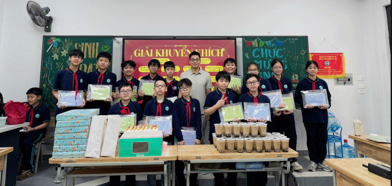 Mở đầu là phần khen thưởng các bạn có thành tích trong đợt vừa qua – một điểm nhấn quan trọng thể hiện rõ sự nỗ lực và tinh thần học tập nghiêm túc của tập thể lớp 7A8. Trong phần này, lớp đã tiến hành tuyên dương với ba nội dung chính. Trước hết, thầy chủ nhiệm khen thưởng học sinh đạt giải trong cuộc thi Olympic cấp trường. Trong đợt thi vừa qua, lớp 7A8 đã đạt được những kết quả vô cùng ấn tượng với tổng cộng 26 học sinh đạt giải. Cụ thể, có 2 bạn đạt giải Nhất, 4 bạn đạt giải Nhì, 6 bạn đạt giải Ba và 14 bạn đạt giải Khuyến khích. Những con số này không chỉ phản ánh năng lực học tập mà còn là minh chứng rõ ràng cho tinh thần cố gắng không ngừng của các bạn học sinh. Thành tích này đã góp phần khẳng định vị thế của lớp 7A8 trong khối, đồng thời tạo động lực mạnh mẽ cho các bạn tiếp tục phấn đấu trong thời gian tới.