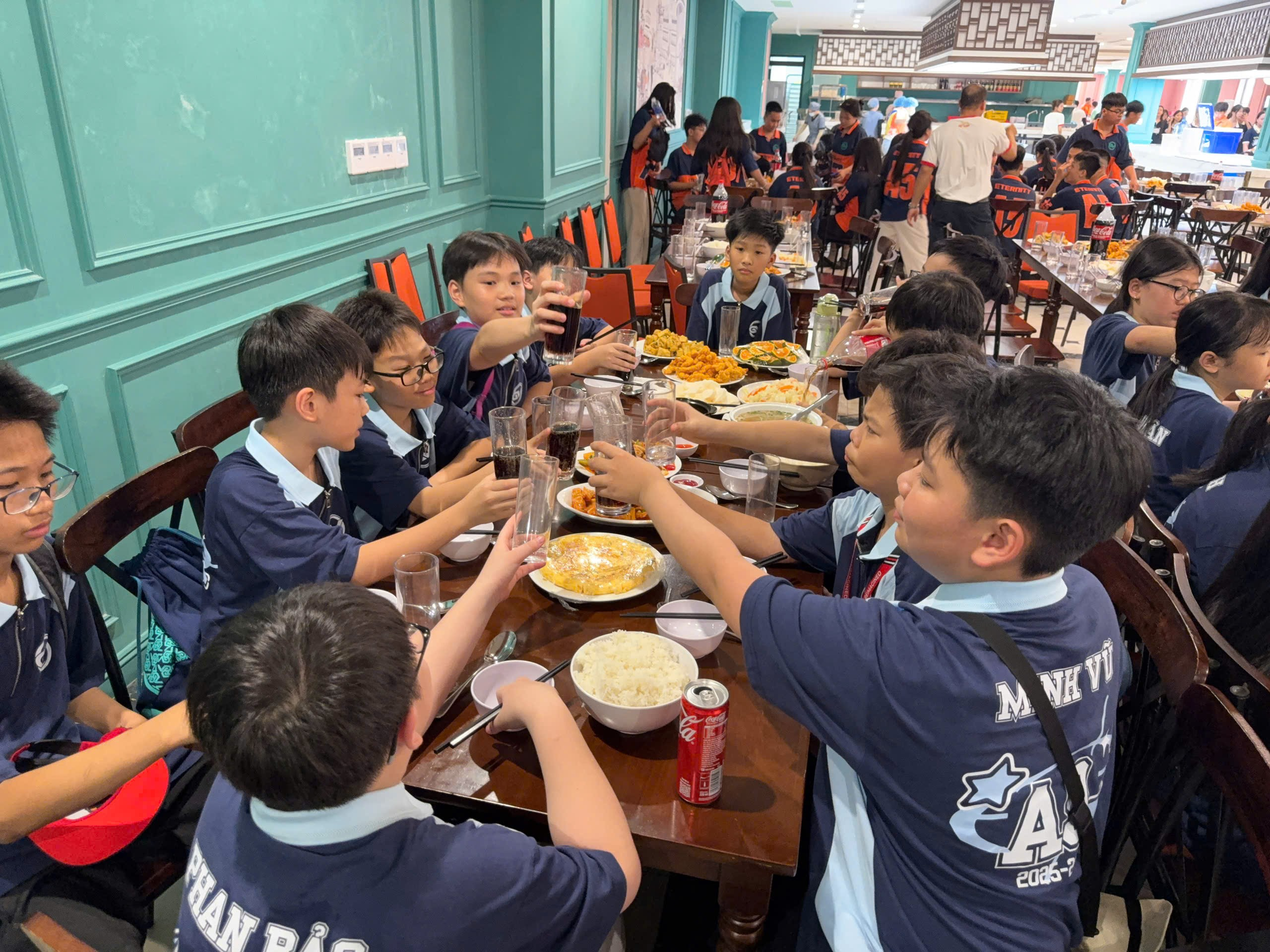 Khi đồng hồ điểm trưa, cả lớp tập trung tại hàng ăn The Grown. Sau buổi sáng chơi hết mình, mọi người đều rất vui vẻ nhưng tấm mệt và đói bụng. Bữa trưa là một trải nghiệm ấm cúng, cả lớp quây quần bên nhau thưởng thức các món ăn hấp dẫn. Thực đơn thịnh soạn bao gồm những món khoái khẩu như gà lắc phô mai thơm lừng, đậu tẩm hành béo ngậy, thịt trưng mắm tép đậm đà, cùng với tôm tươi ngon và những lon Coca mát lạnh. Đây là khoảng thời gian quý báu để chúng tôi cùng trò chuyện, chia sẻ về những kỷ niệm đáng nhớ vừa tạo ra.